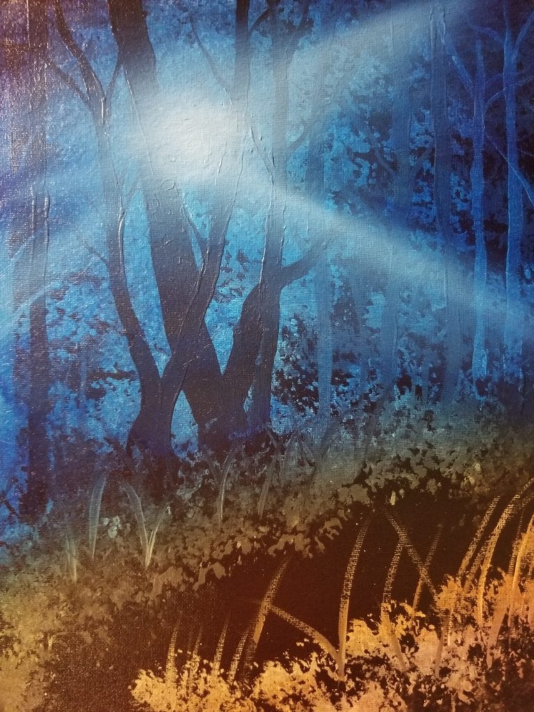 Many years ago I did some painting following the techniques of Bob Ross. It was always such a pleasure watching his show. He was so full of joy and happiness. Lately I’ve realized I’m missing an outlet for my creative expression. My career is focused in the logical analytical word of finance and investing and unfortunately I have let my creative hobbies fall to the side. But I’m making it a point to change that. This is my first painting in probably 20 years. It was inspired by the Divine State of Mind. I’m not sure if I’m quite done with it yet. I feel I want to do a little more to it. And my skills have a lot of room for improvement but IT’S ALL GOOD. I’m happy with how it turned out and it warmed my heart to create it. It helped me let go some of the stress and troubles of every day life so it was a success. I most definitely plan to continue painting as I feel it will help me get closer to The Divine State of Mind.