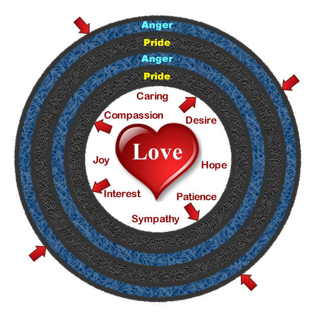 Not only can we not express these emotions towards others, we can’t even feel these emotions ourselves. When looking inwards we can't see our Love. We can’t feel the compassion, the caring nor the patience. We doubt their very existence within us. When we look inside all we see is that wall of anger and pride.